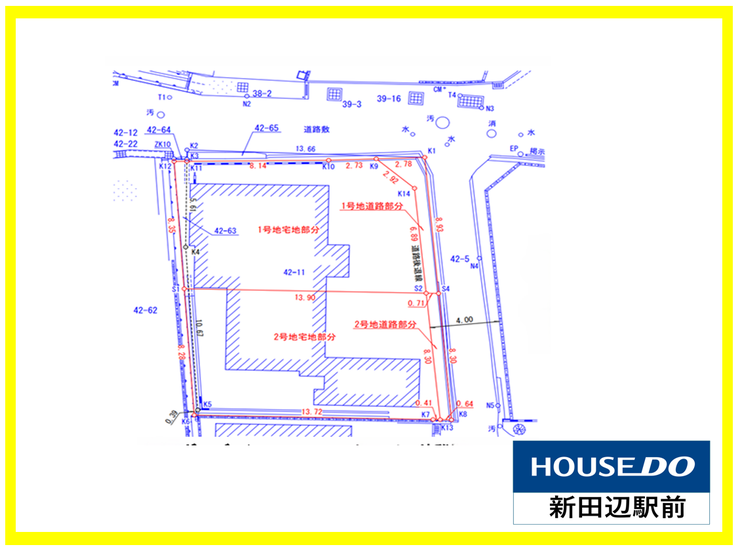 | 備考 | 分筆売り(①1580万/②1280万円)も1筆売り(2580万円)も可能 建築時セットバック面積約約8.64㎡(1号地) ※解体更地渡し ※電線の空中越境有り ※1号地のみ上下水道・電気、引込有り 北側公道幅員約4.7m~5m(建基法1項1号道路) 東側私道幅員約2.7m(建基法2項道路) |